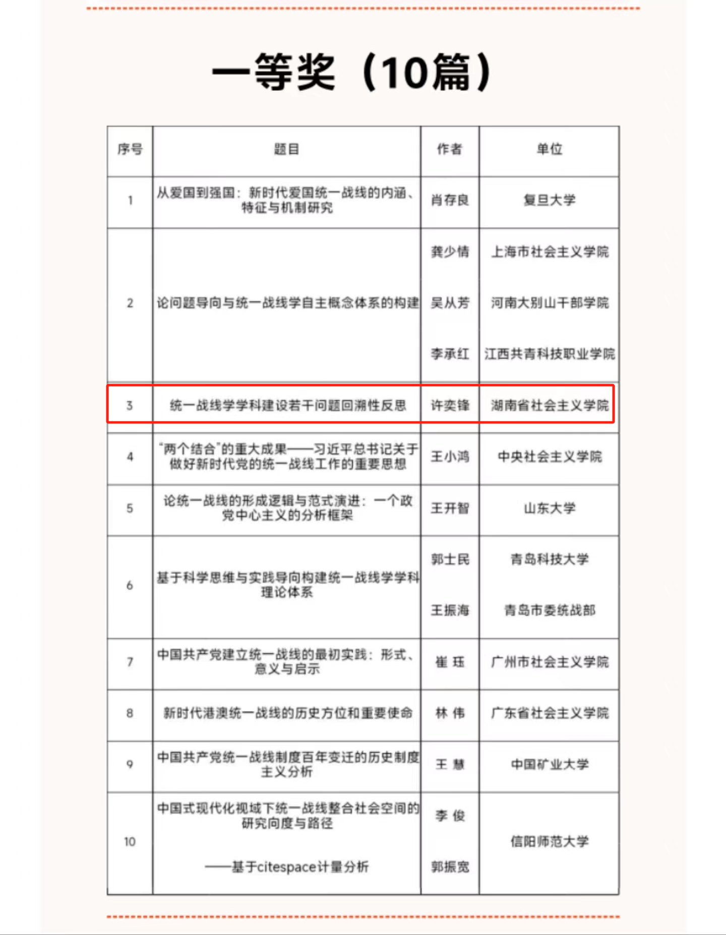 据悉,本届论坛参与面广、学术性强,共收到294篇征文,经专家委员会评审,共评选出一等奖10篇,二等奖20篇,三等奖30篇,优秀奖36篇。我院许奕锋教授论文《统一战线学学科建设若干问题回溯性反思》获一等奖。