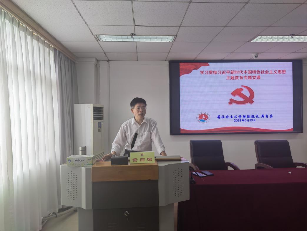 为深入开展学习贯彻习近平新时代中国特色社会主义思想主题教育,6月19日上午,省社会主义学院副院长黄自荣以《习近平新时代中国特色社会主义思想》为题,为所分管的教研部、教务处两个处室党支部讲授专题党课。