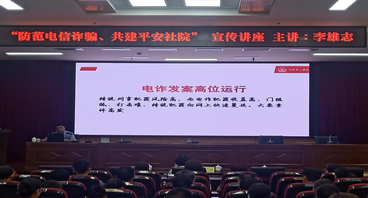 为认真做好网络电信诈骗防范工作,帮助全体教职员工及家属提高识骗防骗意识和能力,6月2日下午,省社院联合芙蓉公安分局马王堆派出所、新桥新村社区,举办“防范电信诈骗、共建平安社院”宣传讲座。社院在家院领导、全体教职员工及家属共80余人参加。